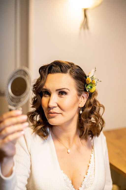 Um deinen Look perfekt zu machen, müssen wir natürlich dein Hochzeitskleid, deinen Blumenstrauß, dein Schmuck, deinen Schleier und deinen Haarschmuck berücksichtigen. Bringe hierfür bitte gerne Bilder oder die Accessoires mit.
